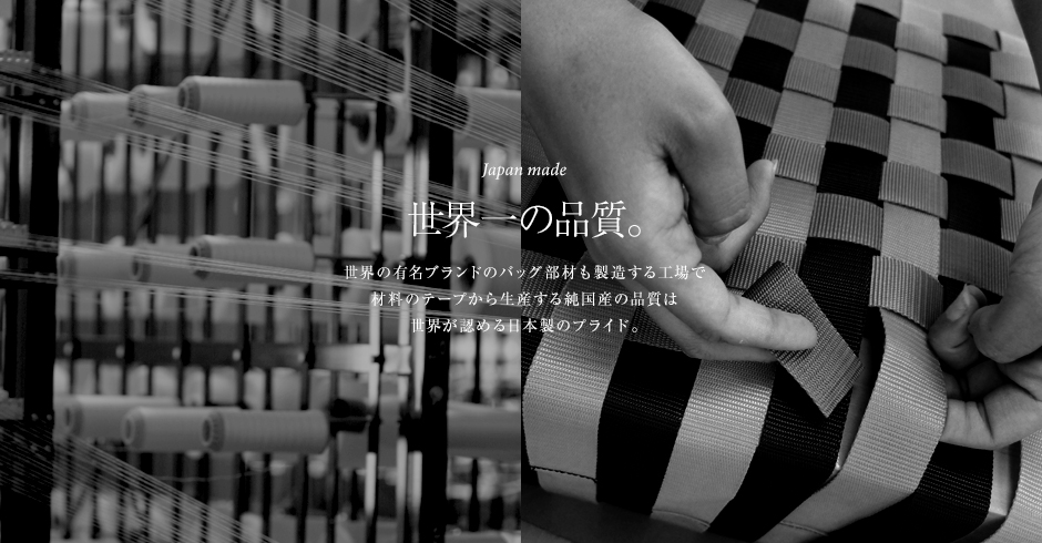 世界一の品質。世界の有名ブランドのバッグ部材も製造する工場で材料のテープから生産する純国産の品質は世界が認める日本製のプライド。