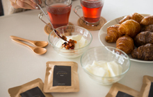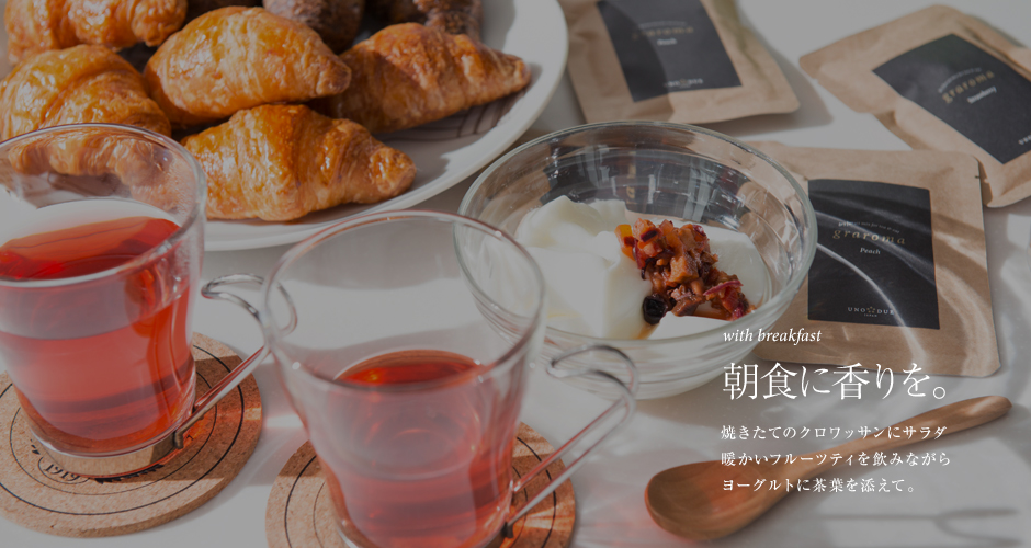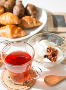 朝食に香りを。焼きたてのクロワッサンにサラダ暖かいフルーツティを飲みながらヨーグルトに茶葉を添えて。