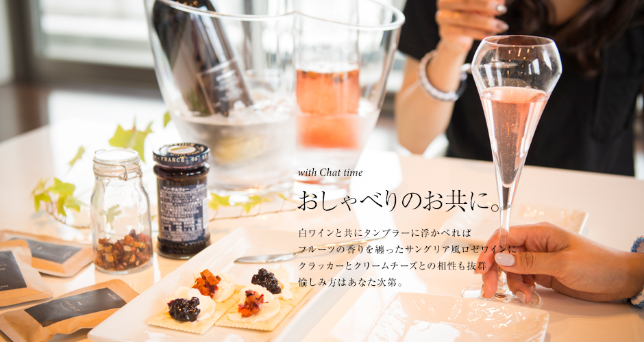 おしゃべりのお共に。白ワインと共にタンブラーに浮かべればフルーツの香りを纏ったサングリア風ロゼワインに。クラッカーとクリームチーズとの相性も抜群。愉しみ方はあなた次第。