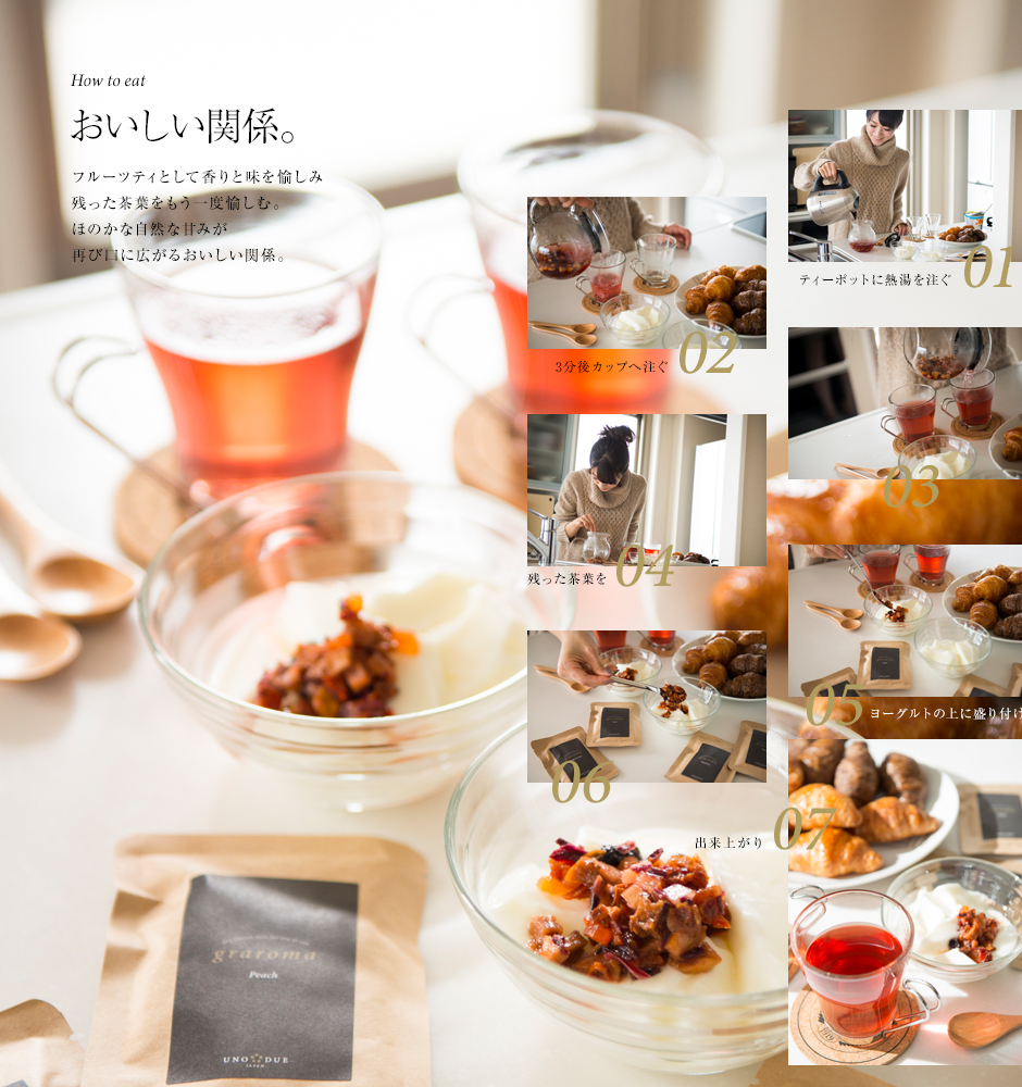 おいしい関係。フルーツティとして香りと味を愉しみ残った茶葉をもう一度愉しむ。ほのかな自然な甘みが再び口に広がるおいしい関係。